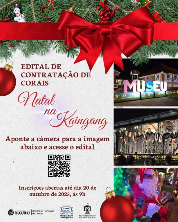 A Secretaria de Cultura da Prefeitura de Bauru informa que as inscrições para o edital de contratação de corais do 2º Natal na Praça Kaingang encerram-se nesta segunda-feira, dia 20, às 9h. O evento, que promete encantar a cidade em dezembro, ocorrerá no Museu Ferroviário Regional de Bauru. Para participar, as inscrições devem ser realizadas exclusivamente de forma online. O edital completo, juntamente com o formulário necessário para a inscrição, pode ser encontrado no site oficial da prefeitura.